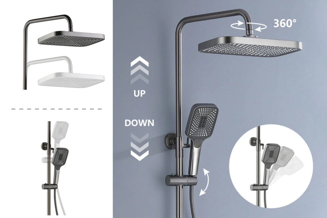 Das System ist in der Höhe flexibel einstellbar. So kannst du Haupt- und Handbrause optimal positionieren – ideal für unterschiedliche Nutzer. Die Stange lässt sich leicht verschieben und fixieren, für ein individuelles, komfortables Duscherlebnis für die ganze Familie.